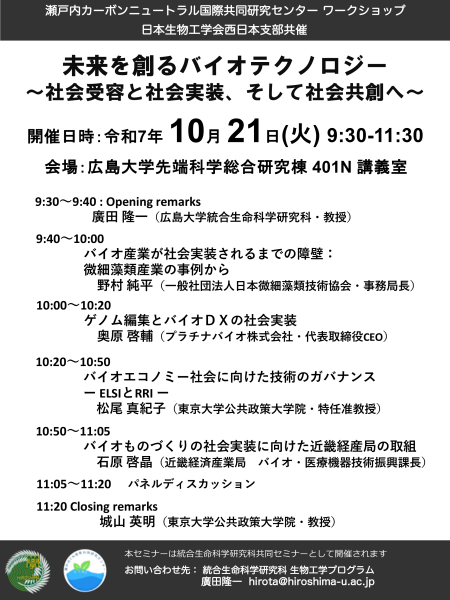 2025/10/21: Seto Inland Sea Carbon Neutral International Joint Research Center Workshop: Biotechnology that Creates the Future: Toward Social Acceptance, Implementation, and Co‑creation